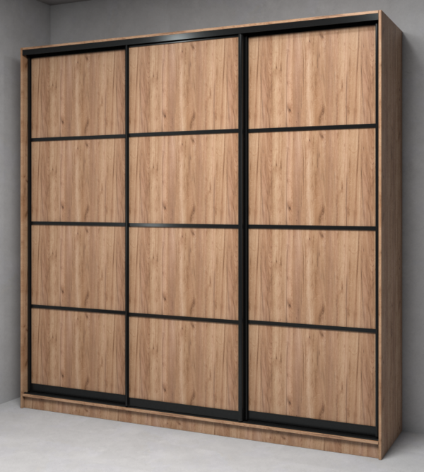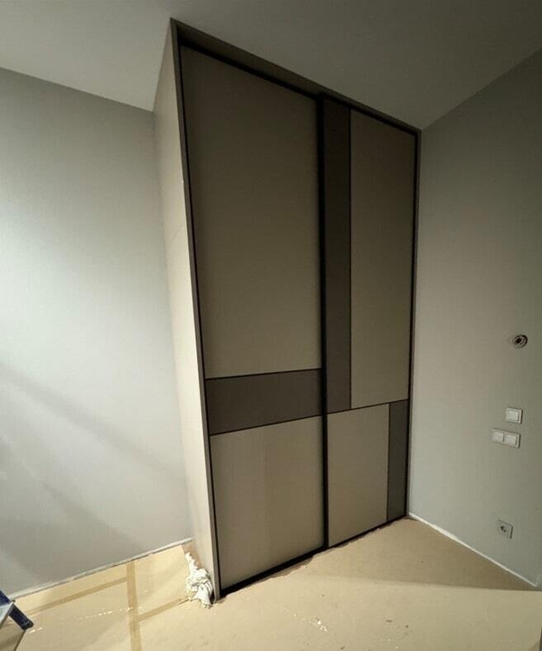 Современный шкаф купе с декоративной вставками и узким чёрным профилем